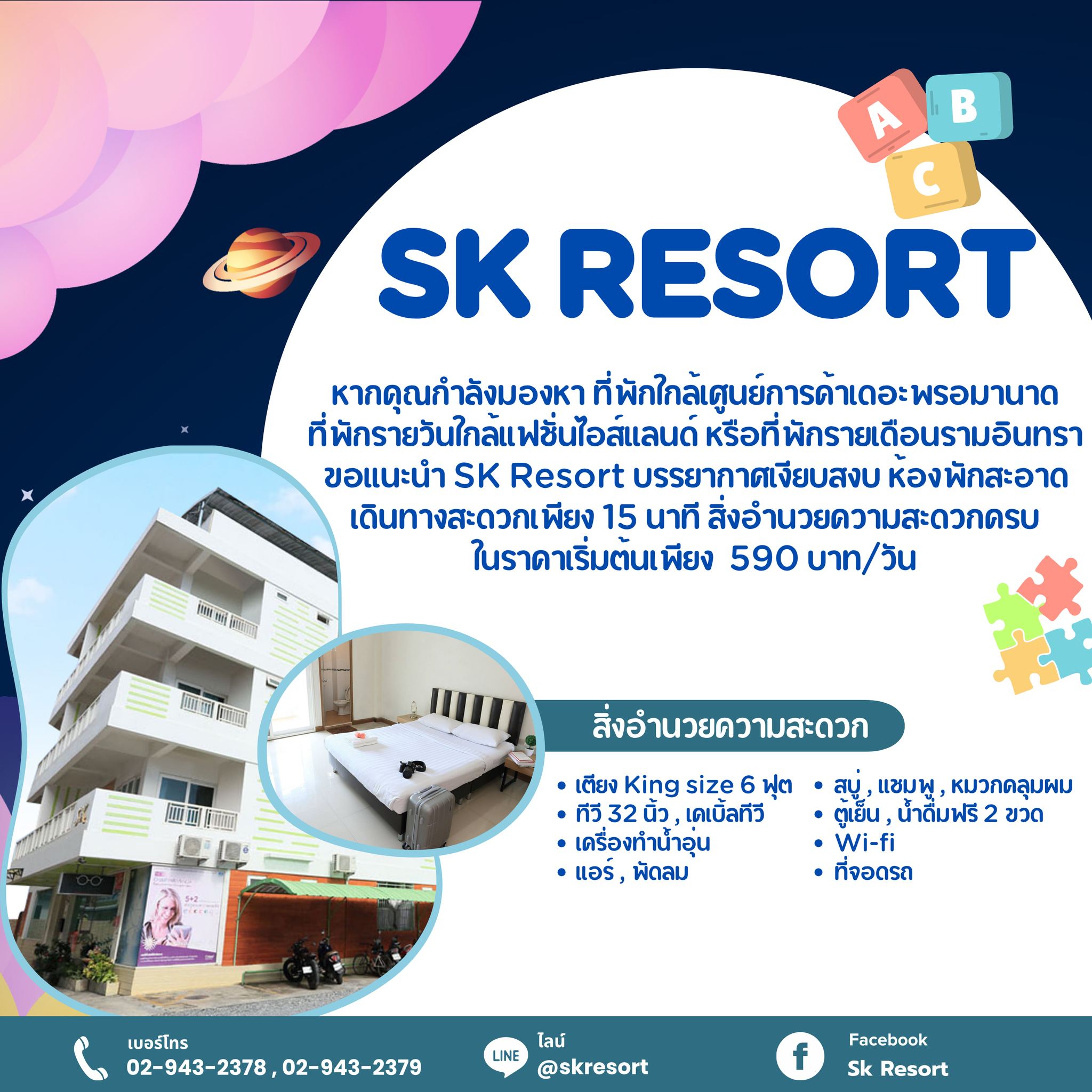 ที่พักแนะนำใกล้สถานที่จัดงาน แนะนำ SK Resort ที่พักรามอินทราใกล้แฟชั่นไอส์แลนด์ ที่พักหลักร้อยรามอินทราใกล้แฟชั่นไอส์แลนด์ ที่พักราคาถูกรามอินทราใกล้แฟชั่นไอส์แลนด์ ห้องพักใกล้ที่เที่ยวรามอินทรา ที่พักติดถนนรามอินทรา ห้องพักพร้อมที่จอดรถรามอินทรา ระยะสั้นรามอินทราเดินทางง่ายเพียง 7 นาที ราคาเริ่มต้น 590.- บาท คุ้มค่าแถมยังประหยัดเวลาในการเดินทางแล้วมาพักที่ SK Resort กันนะคะ