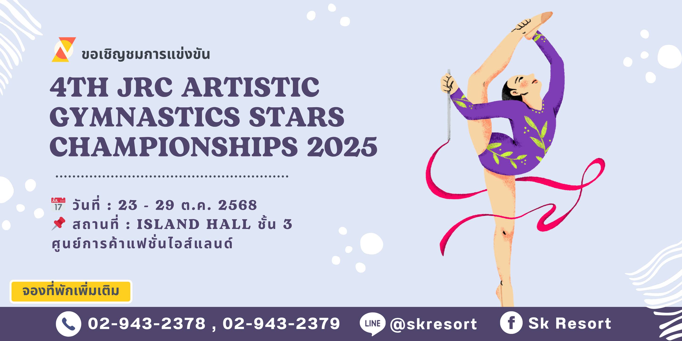 ✨ 4th JRC Artistic Gymnastics Stars Championships 2025สุดยอดเวทีประชันทักษะยิมนาสติกศิลป์ระดับประเทศ! ศูนย์การค้าแฟชั่นไอส์แลนด์ร่วมกับสโมสรยิมนาสติก JRC ขอเชิญผู้ที่ชื่นชอบกีฬายิมนาสติกและผู้ปกครองทุกท่าน ร่วมชมและให้กำลังใจนักกีฬาตัวน้อยในงาน “4th JRC Artistic Gymnastics Stars Championships 2025” การแข่งขันยิมนาสติกศิลป์ที่ยิ่งใหญ่และมีมาตรฐานระดับประเทศ ซึ่งจัดขึ้นเป็นปีที่ 4 ติดต่อกัน